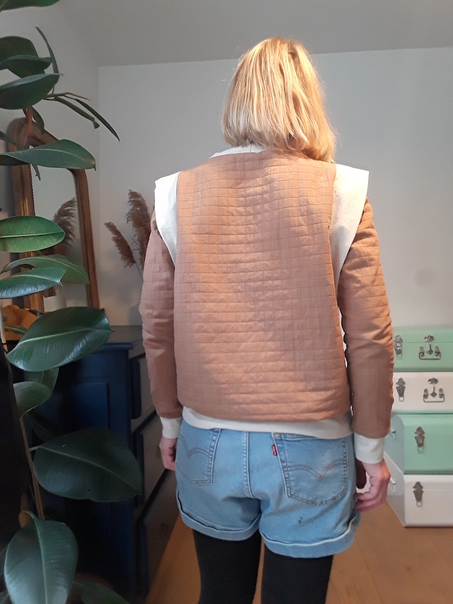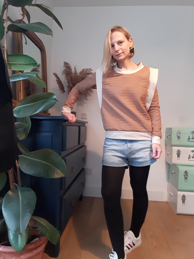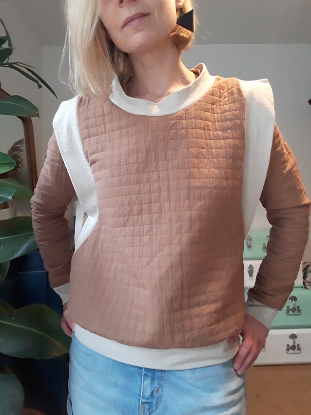 D’abord, le choix du tissu : comme je vous l’ai dit plus haut, j’avais craqué sur le tissu des cousettes de fichettes : le coton matelassé France Duval Stalla en couleur caramel. Avec l’idée de faire comme sur les modèles que j’avais repéré : un sweat uni ! Vu mes photos, vous voyez déjà que ca ne s’est pas passé comme prévu !