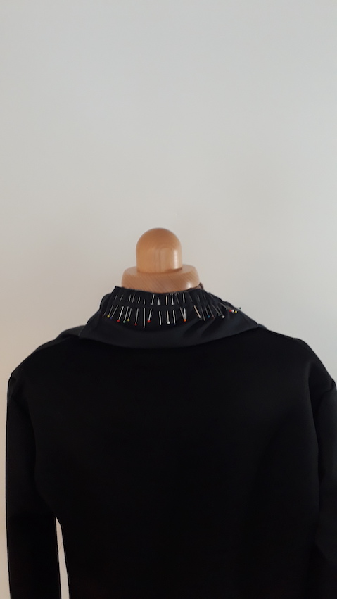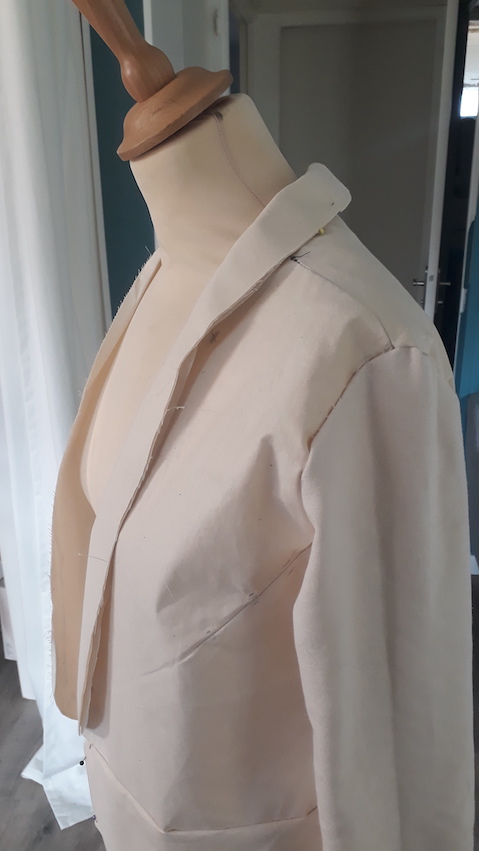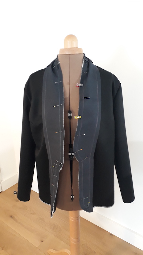 On a évidemment travaillé un seul côté complètement pour ne pas avoir d’asymétrie. Les poches n’ont pas été préparées à l’avance sur le patron, on les a décidé au dernier moment et fait uniquement sur le vrai tissu.