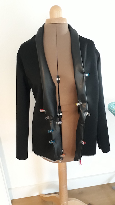 L’objectif de cette formation : faire une veste tailleur assez longue, pas trop cintrée, bi-matière : je n’avais pas choisi la première matière, mais pour le col je souhaitais du simili cuir.