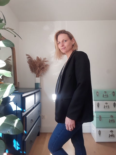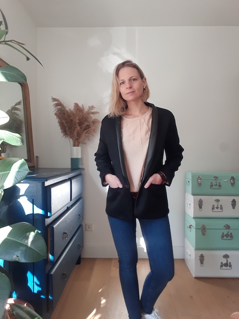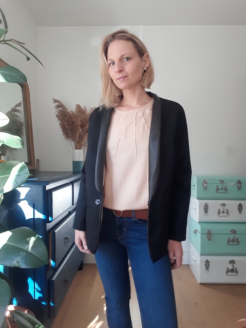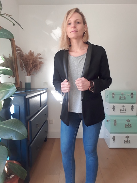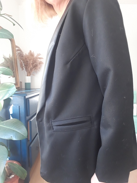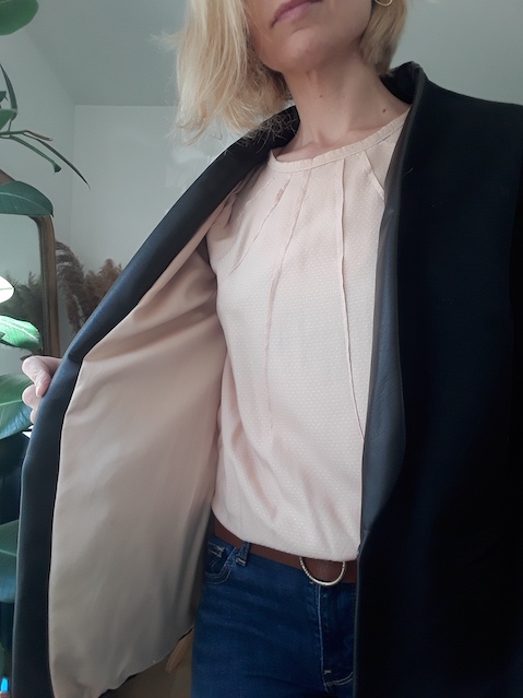 Au montage, la complexité est surtout survenue à cause des matières qui ne marquaient pas et donc assez difficile à positionner. Pour mieux maintenir le bas de la veste, j’ai fait un point chausson pour positionner l’ourlet avant de coudre doublure et tissu. Puis un point invisible , ce qui a permis de ne pas retourner complètement la veste par la manche et éviter une manipulation supplémentaire.