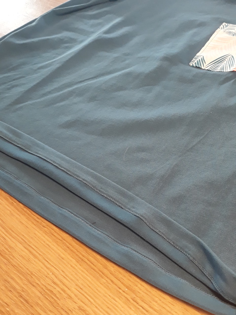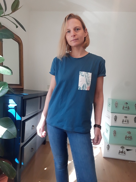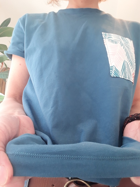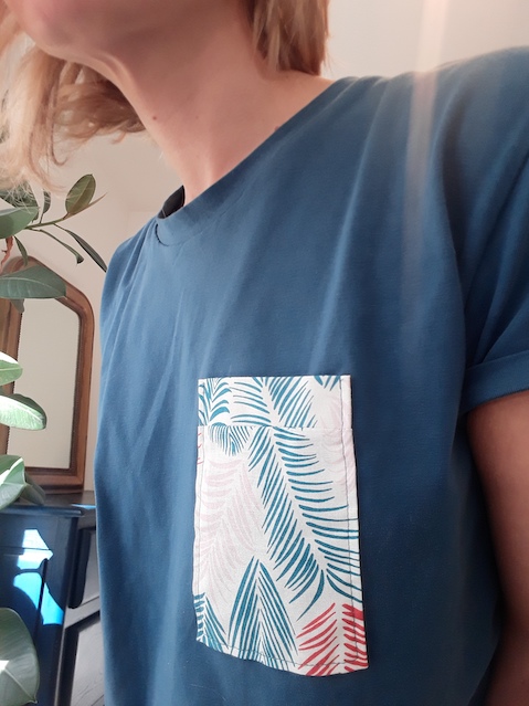 Pour la poche, j’ai utilisé une chute de tissu imprimé que j’avais acheté pour le top panama de Maison Fauve. J’ai hésité longtemps car les couleurs n’étaient pas vraiment assorti au bleu du jersey, mais j’aimais bien l’imprimé feuillage qui donnait un petit côté peps et été à ce t.shirt ultra basique. Par contre, je crois que je ne l’ai pas plaqué bien droite, je m’en suis aperçue en le pliant. Mais porté ca ne se voit pas trop. En fait, j’avais tracé en découpant l’emplacement dans le patron, mais je pense que la prochaine fois, je me baserai sur le pli milieu pour positionner la poche bien parallèle.