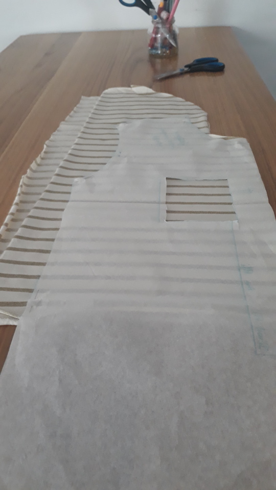 Alors vous allez le voir sur les photos, quand je parle de chutes : j’ai des bandes de la largeur du laize donc parfait pour couper au pli…mais je n’ai clairement pas la hauteur souhaitée pour le t.shirt. J’aurais pu faire un crop top… mais bon ca ferait pas super sérieux au boulot 😀