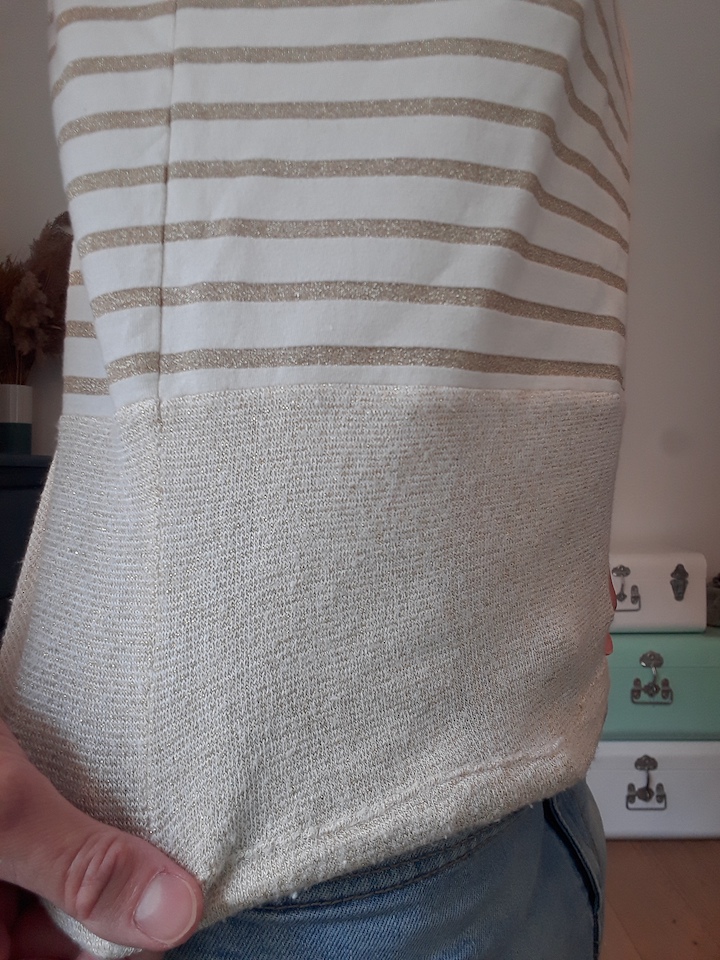 - Le raccord de la marinière. En jersey, ca matche toujours super bien au début puis au milieu ca décale, je ne comprend jamais pourquoi. J’ai un côté super raccord et un autre raccord en haut et en bas avec un décalage au milieu => presque !