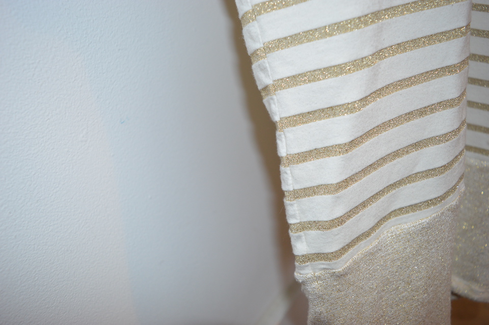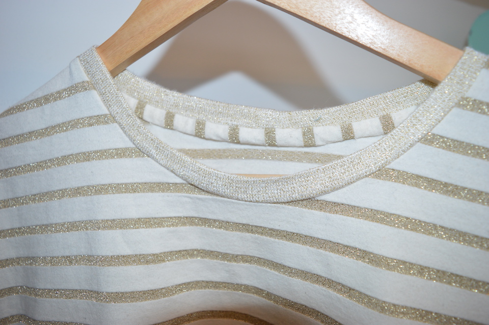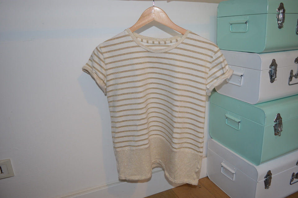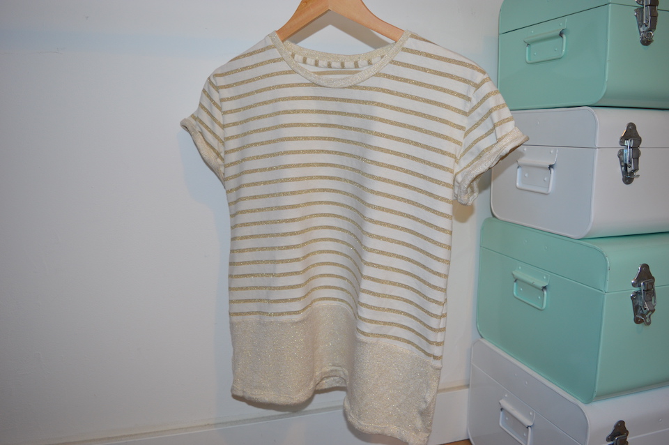 Du coup, j’ai trouvé une autre chute doré pour faire le bas. Et ca donne donc un petit top super sympa, plus féminin que la version précédente grâce au lurex. Quand je vous dit que selon le tissu choisi, ce t.shirt rend différemment 😉