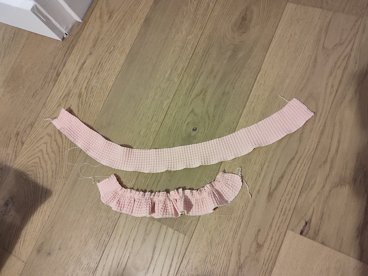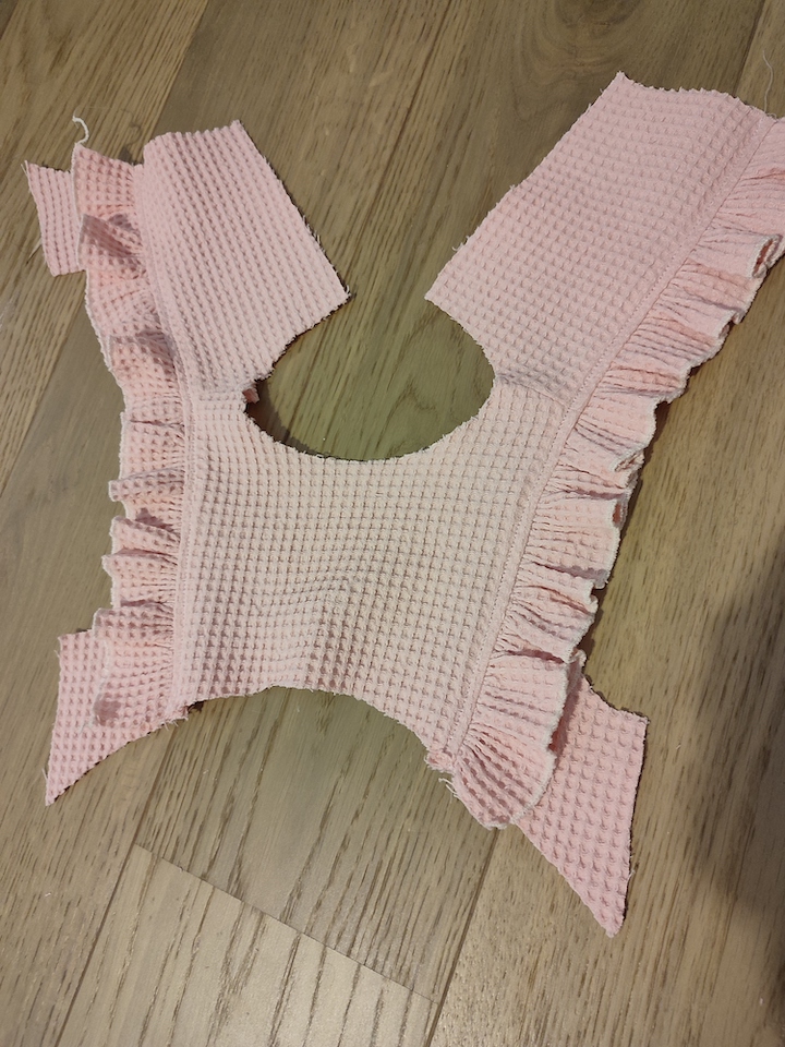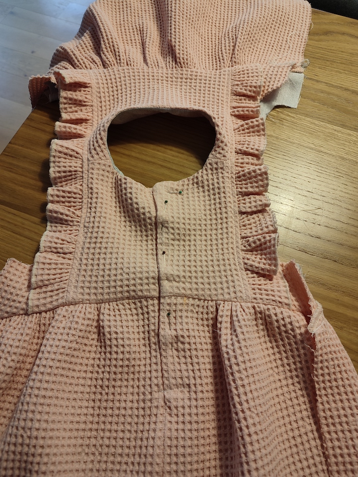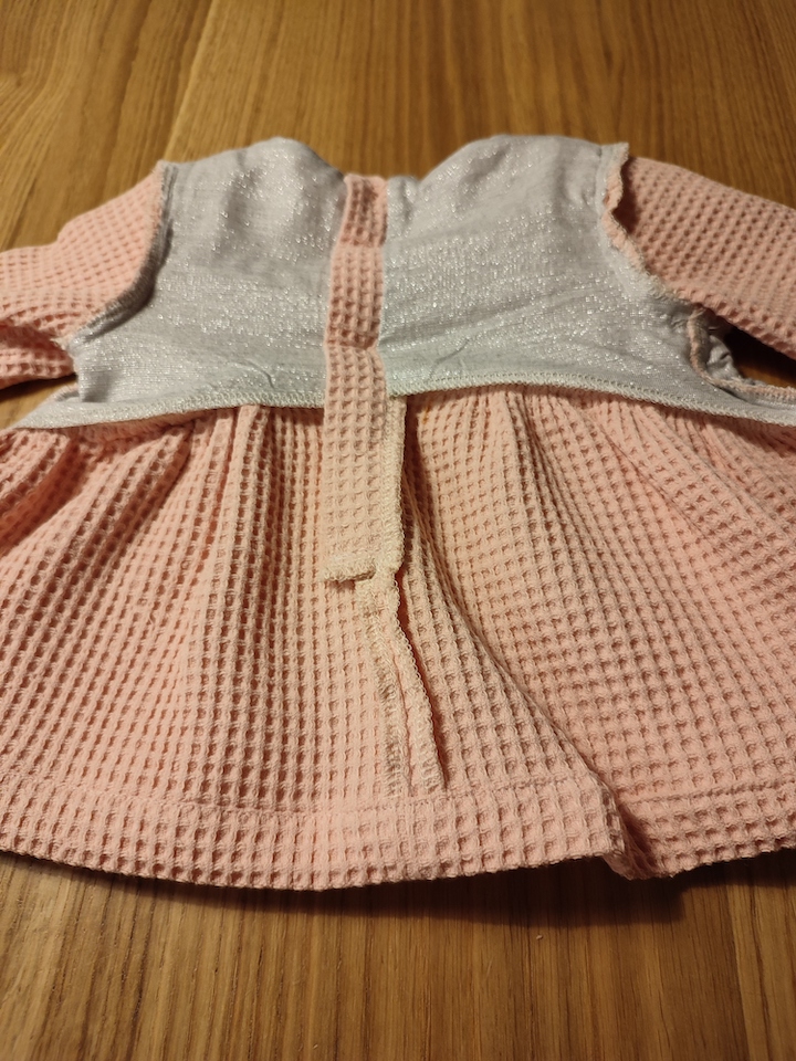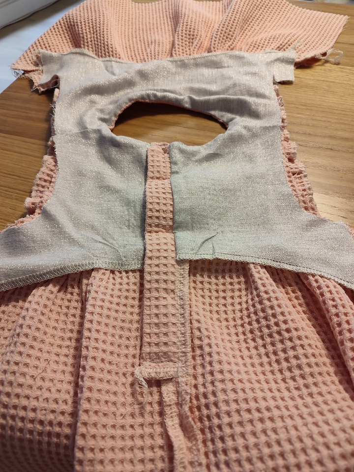 Pour le bas, j’ai raccourci la robe car elle me semblait assez longue et je préfère celles qui arrivent au genou. Ceci étant, je suis quasi-sure qu’il faudra que j’adapte la longueur une fois que notre fille pourra loger dedans 😅.