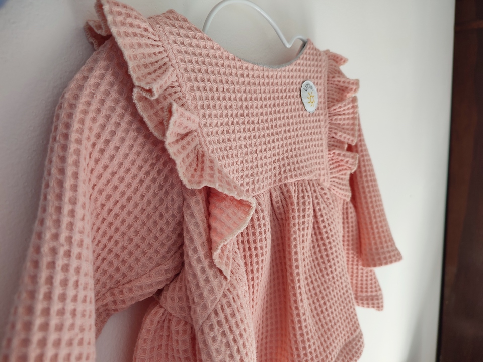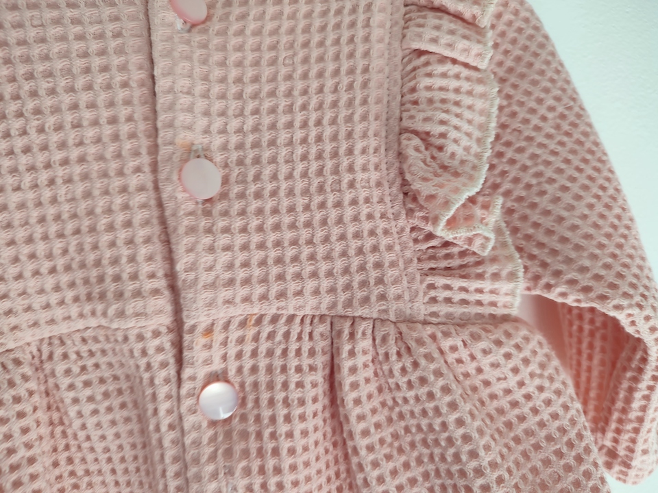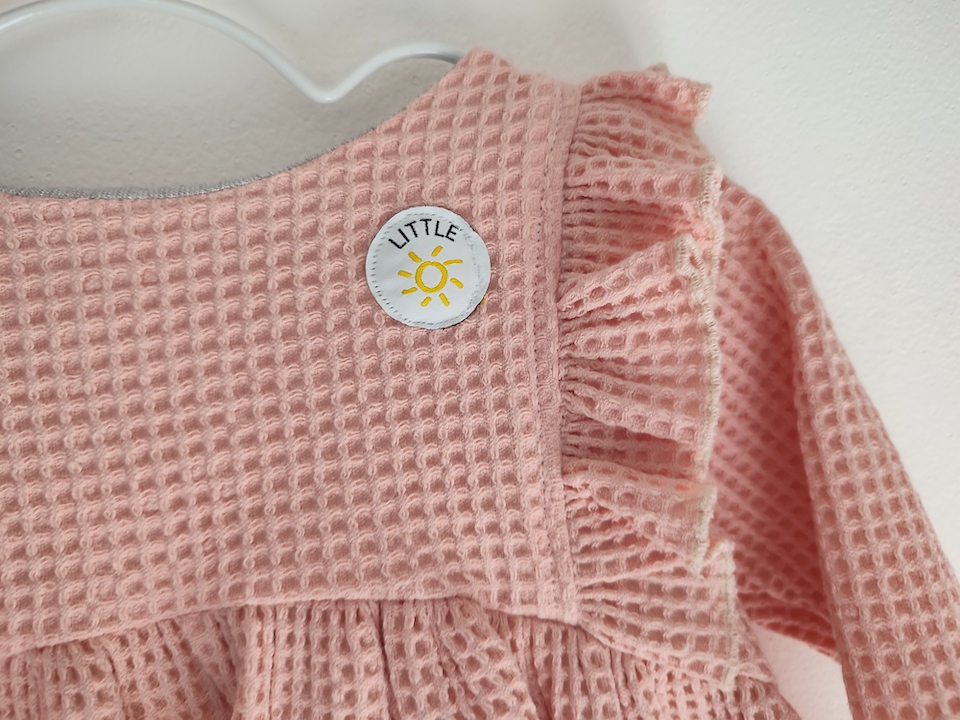 Niveau tissu, j’ai opté pour du nid d’abeille bio de Mondial Tissu en rose. J’ai pas mal hésité sur la couleur : je ne suis pas une grande fanatique du rose, et je ne souhaite pas catégoriser les couleurs selon le sexe de l’enfant. Donc majoritairement, nous avons choisi des habits de différentes couleurs : bleu, vert, marron, beige … mais une pointe de rose ne fera pas de mal pour une fois 😉